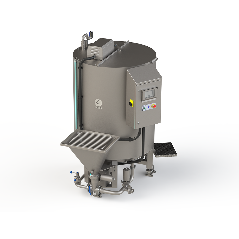 The GAROS GLB is one of the only brine mixing machines designed to handle a large variety of ingredients. Brine and marinade recipes, recently, have been modified to include a higher level and more difficult to dissolve, ingredients/dry substances. This has increased preparation requirements in relation to handling, mixing, and dissolving the ingredients. The GLB is available in sizes 500, 1000, 1500 to 2000 litres. The tank is made of 316 acid resistant stainless-steel.